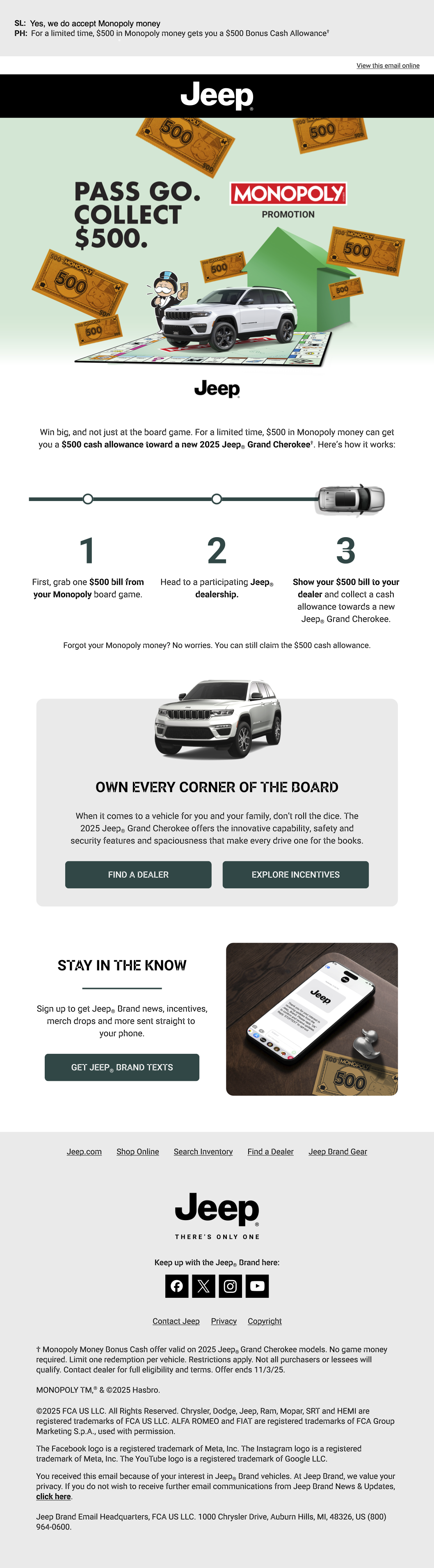 Wrangler and Gladiator Mojito Website Banner Jeep Cherokee Reveal Campaign Grand Cherokee Monopoly Incentive